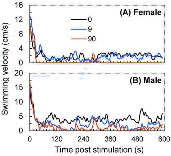 The time-dependent variation in the swimming velocity of female (A) and male (B) zebrafish exposed to ZIF-8 NPs at 0 (control), 9.0, and 90 mg L−1. Data were measured within 10 min post the ball falling stimulation and are shown as the average value of 4 fish within 5 s intervals.