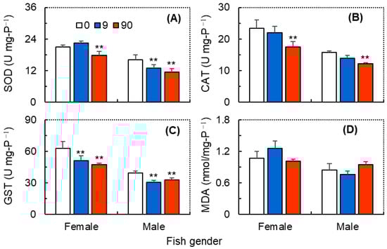 The brain levels of SOD (A), CAT (B), GST (C) and MDA (D) in female and male zebrafish (Danio rerio) exposed to ZIF-8 NPs at 0 (control), 9.0 and 90 mg L−1. Data are mean ± SD (n = 3), and asterisks indicate significant differences between the exposure and control (** p < 0.01).