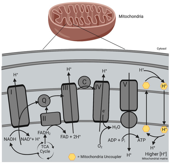 Synthetic mitochondrial uncouplers can act as protonophores whereby they transport protons from the intermembrane space across the inner mitochondrial membrane to the matrix in a protein-independent uncoupling process (Figure 3). This dissipates the PMF that is required for the coupling process between the ETC and ATP synthesis in oxidative phosphorylation [143].