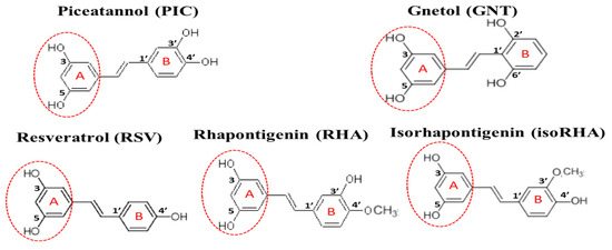 The structures of piceatannol (PIC), gnetol (GNT), resveratrol (RSV), rhapontigenin (RHA), and isorhapontigenin (isoRHA). All compounds contained the same 3,5-dihydroxybenzene group (ring A, dashed red circle).