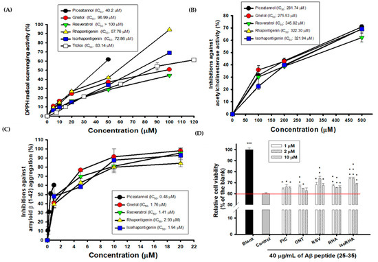 The hydroxylated stilbenes of PIC and its analogs, GNT, RSV, RHA, and isoRHA (Figure 1), were used to evaluate in vitro biological activities. All compounds contained the same 3,5-dihydroxybenzene group (ring A, dashed red circle). Figure 2A shows the DPPH radical scavenging activities. It was found that PIC and its analogs showed dose-dependent DPPH radical scavenging activities, and the IC50 of the DPPH radical scavenging activities of PIC, GNT, RSV, RHA, and isoRHA were, respectively calculated to be 40.2 μM, 96.99 μM, higher than 100 μM, 57.76 μM, and 72.86 μM in this study’s assays. The IC50 of the positive control, Trolox, was 83.14 μM. The DPPH scavenging capacity of PIC was 2.5-fold and 2.07-fold higher than that of RSV and Trolox, respectively. The scavenging order of the DPPH radical was PIC > RHA > isoRHA > Trolox > GNT > RSV. Figure 2B shows the in vitro anti-AChE activities among the five hydroxylated stilbenes. It was found that PIC and its analogs, GNT, RSV, RHA, and isoRHA, showed dose-dependent AChE inhibitory activities, and the IC50 of the anti-AChE activities of PIC, GNT, RSV, RHA, and isoRHA were calculated to be 281.74 μM, 275.53 μM, 345.82 μM, 322.30 μM, and 321.94 μM, respectively, in this study’s assays, with the AChE inhibitory capacity of PIC being 1.23-fold higher than that of RSV. The inhibitory order against AChE in the present results was GNT ≅ PIC > isoRHA ≅ RHA > RSV. Figure 2C shows the in vitro anti-Aβ peptide (1–42) aggregations among five hydroxylated stilbenes. It was found that PIC and its analogs showed dose-dependent inhibitions against Aβ peptide (1–42) aggregations. The inhibitory order against the Aβ peptide aggregations was PIC > RSV > GNT > isoRHA > RHA. The IC50 of the anti-Aβ peptide aggregations of PIC, GNT, RSV, RHA, and isoRHA were calculated to be 0.48 μM, 1.76 μM, 1.41 μM, 2.93 μM, and 1.94 μM, respectively, in the present assays, and the anti-Aβ aggregations capacity of PIC was 2.94-fold higher than that of RSV. Figure 2D shows the neuroprotective activities against the Aβ peptide (25–35)-induced cell deaths in SH-SY5Y cell models. The treatment of 40 μg/mL of the Aβ peptide (25–35) showed a reduction in cell viability from 100% to about 60% (control). With each compound having insignificant cytotoxicity (Supplementary Figure S1), the pre-treatment of PIC, GNT, RSV, RHA, and isoRHA (1, 2, and 10 μM) for 24 h showed that the neuroprotection elevated cell viabilities and produced significant differences as compared to the control (p < 0.05 *, 0.01 **, 0.001 ***).