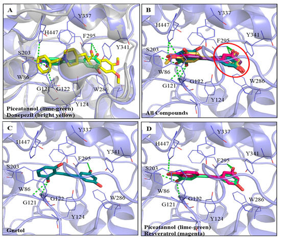 Interactions analysis between AChE (PDB ID: 4EY7) and PIC or its analogs. (A) Superimpose docking poses of donepezil (bright yellow) and PIC in active site regions of AChE; (B) Docking poses of gnetol (blue-green), piceatannol (lime-green), isorhapontigenin (purple), rhapontigenin (yellow), and resveratrol (magenta) in the active site of AChE (light blue). The 3,5-dihydroxybenzene group (ring A, red circle); (C) The docking pose of GNT in active site regions of AChE; (D) Superimposed docking poses of RSV and PIC in AChE active site. Hydrogen bonds were represented as green dash lines. Residues were labeled as shown. The figures were created using Pymol.