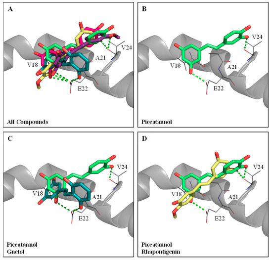 The five hydroxylated stilbenes were docked into the Aβ peptide (1–42) (PDB ID:1Z0Q). All compounds contained the same 3,5-dihydroxybenzene group (ring A) with different substitutes for the hydroxyl group or the methoxyl group in ring B (Figure 1). However, the Aβ peptide (1–42) does not have any known crystalized structure with a co-crystallized ligand. Therefore, the binding site was set to cover the whole protein. It was found that all compounds occupied the same segment of the Aβ peptide (1–42) helix (Figure 4A) with different interactions. The docking poses of GNT (blue-green), PIC (lime-green), isoRHA (purple), RHA (yellow), and RSV (magenta) in the Aβ peptide (1–42) (gray) are shown in the figure. All five compounds occupied and interacted with the same region (amino acid residues 18–24) of the Aβ peptide (1–42). The docking poses of PIC, GNT, and RHA are separately described below.