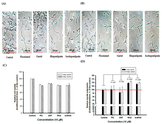 The human SH-SY5Y neuroblastoma cell lines (CRL-2266, Lot No. 58979771) were purchased from American Type Culture Collection (Manassas, VA, USA) and used as models to investigate PIC and its analogs for neuroprotective activities against Aβ-induced cell deaths and the stimulation of neurite outgrowths. The SH-SY5Y cells were grown in DMEM/F-12 medium supplemented with 10% FBS at 37 °C under a humidified atmosphere and 5% CO2 [41]. To study the neuroprotective activities against Aβ peptide (25–35)-induced cell deaths, a previous method [42] was modified as follows. The SH-SY5Y cells (10,000 cells/well) were seeded and cultured in a DMEM/F-12 medium containing 10% FBS for 24 h at 37 °C under a humidified atmosphere and 5% CO2. After being removed from the culture medium, each PIC, GNT, RSV, RHA, and isoRHA (at a final concentration of 1, 2, and 10 μM in the 0.1%DMSO) or 0.1% DMSO (the control) was added to the medium for a 24 h culture. The medium was then removed, and 40 μg/mL Aβ peptide (25–35) (dissolved in PBS) or an equal aliquot of PBS was added to the medium for another 24 h culture. The MTT was used to evaluate cell viability, and the absorbance at 570 nm was determined [43]. The DMSO used instead of the sample solution was blank (recognized as 100%), and each treatment was expressed as relative cell viability (%). To study the stimulation of neurite outgrowth, the SH-SY5Y cells (5000 cells/well) were seeded on a 96-well plate pre-coated with poly-L-lysine and then cultured in the DMEM/F-12 medium containing 10% FBS overnight at 37 °C under a humidified atmosphere and 5% CO2. After being removed from the culture medium, each PIC, GNT, RHA, and isoRHA (at a final concentration of 10 μM in the 0.1%DMSO) or 0.1% DMSO (the control) was added to the DMEM/F-12 medium containing 10% FBS and refreshed every three days. On day 3 and day 6, each of the culture plates was photographed using an inverted microscope (ECLIPSE TS100, Nikon Instruments Inc., Tokyo, Japan). The culture medium was removed and washed with PBS, and the cultured cells in each well were fixed with 4% paraformaldehyde. To measure cell viability and quantify the neurite outgrowths of the treated SH-SY5Y in a 96-well plate, the neurite outgrowth staining kit (a two-color fluorescence assay kit) was used, following a previous report [44] or the protocol in the manufacturer’s manual (publication number: MAN0007224), which included a cell membrane-stained fluorescent dye (orange-red fluorescence), a cell viability indicator (green fluorescence), and a reagent for background masking. The fluorescence ratios of Ex555nm/Em565nm and Ex495nm/Em515nm were determined for the neurite outgrowths and the cell viabilities, respectively. The value for the control was recognized as 100%, and each treatment was expressed relative to the control.