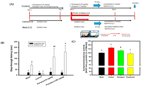 Effects of piceatannol pre-treatments on improvements of cognitive dysfunctions in scopolamine-induced amnesiac ICR mice. (A) The preventive protocol of PIC pre-treatment once a day (50 mg/kg) for 7 days before a learning behavior evaluation and donepezil (5 mg/kg) was used as the positive control. (B) The step-through latency (s) of mouse in a two-day trial of the passive avoidance test, the first day was the acquisition trial and the second day was the retention trial. (C) The AChE activity in the brain extracts of the blank and the treated groups. Multiple group comparisons were performed using one-way analysis of variance (ANOVA) and the post hoc Tukey’s test, and the different lowercase alphabet letters (for the acquisition trial) or uppercase alphabet letters (for the retention trial or the AChE activity in the brain extracts) in each bar were considered significantly different (p < 0.05).