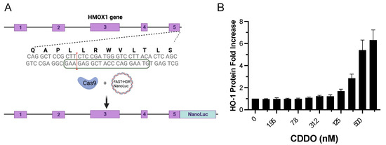 Generation of a CRISPR/Cas9-engineered cell line with endogenous tagging of HMOX1 using Nanoluc luciferase and examination of its response to NRF2 induction. (A) Schematic representation of the HMOX1 gene locus targeted for CRISPR/Cas9 induced double-strand break. The exons of the HMOX1 gene are indicated with numbers 1 to 5. The boxed sequence on the lower DNA strand marks the location of the single guide RNA (sgRNA) used to direct CRISPR/Cas9 to the targeted genomic region. The red line signifies the CRISPR/Cas9 double-strand break site, indicating where the insertion of the Nanoluc luciferase tag was inserted. (B) Dose–response curve displaying the expression of endogenous HMOX1-Nanoluc luciferase in response to treatment with CDDO-me, a known NRF2 activator. Cells were treated with two-fold dilutions of CDDO-me, starting from 1000 nM, over a 24 h period. The resulting changes in HMOX1 expression were monitored, demonstrating the functionality of the Nanoluc luciferase tag in tracking HMOX1 expression levels.
