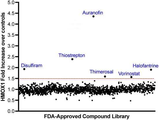 Screening of a Library of FDA-Approved Compounds to Identify HMOX1 Inducers. A library of 1200 FDA-approved compounds was screened at 500 nM over a 24 h period to detect inducers of HMOX1 protein expression. The x-axis represents individual compounds, while the y-axis shows the fold change in HMOX1 expression. A threshold for potential hits, indicated by a red line, was determined as the mean fold change across all compounds plus three times the standard deviation. Out of the entire library, six compounds—Disulfiram, Thiostrepton, Auranofin, Thimerosal, Halofantrine, and Vorinostat—exceeded this threshold.