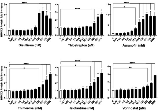Overall, our results demonstrate that the six identified compounds, Disulfiram, Auranofin, Thiostrepton, Thimerosal, Halofantrine, and Vorinostat, have the capacity to promote HMOX1 expression in a dose-dependent manner.