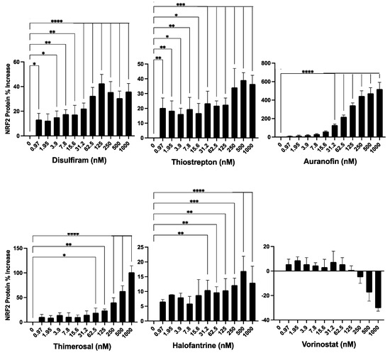 Our findings revealed that the compounds induced an increase in NRF2 protein expression, though to varying degrees (Figure 4). Thimerosal and Auranofin led to a significant increase in NRF2 expression, ranging from a 100% to a 500% maximum increase over basal levels. Disulfiram and Thiostrepton, on the other hand, showed a moderate rise in NRF2 expression, with a maximum increase of 20% to 40% over basal levels. Halofantrine and Vorinostat resulted in a low increase in NRF2 expression, with a maximum increase of 5% to 20% over basal levels. It is important to note, however, that the changes in NRF2 expression induced by Vorinostat were not statistically significant. Furthermore, Vorinostat was the only compound that exhibited a suppressive effect on NRF2 expression at concentrations above 125 nM, leading to a decrease in basal NRF2 expression.
