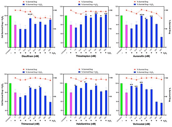 We found that all evaluated compounds ameliorated the reduction in cell viability caused by exogenous hydrogen peroxide, albeit with varying levels of protection (Figure 5). Disulfiram exhibited a protective effect at 31 nM, while Thiostrepton was highly effective in reducing H2O2-induced cell death between 31 and 500 nM. Auranofin also prevented cell death caused by H2O2 at doses between 31 and 125 nM. Thimerosal demonstrated a moderate benefit between 31 and 125 nM, Halofantrine was effective in protecting the cells from 7.8 to 125 nM, and Vorinostat was only effective at low doses between 7.8 and 31 nM.