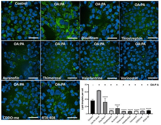 We evaluated the ability of identified NRF2 inducers to prevent lipid droplet accumulation in HUH-7 cells. We seeded 8000 cells per well in 100 μL of culture media in CellCarrier Ultra 384-well glass bottom plates (Perkin Elmer, Waltham, MA, USA). After 16 h, we treated the cells with each of the compounds (Disulfiram, Thiostrepton, Auranofin, Thimerosal, Halofantrine, and Vorinostat), along with two known NRF2 inducers (CDDO-me and RTA-408), at a uniform concentration of 250 nM for 24 h. This concentration was chosen based on our preliminary findings that demonstrated its consistent effectiveness in activating HMOX1 expression for most of the compounds, and its minimal impact on the viability of HUH-7 cells for most of the compounds. We then stimulated lipid droplet formation by treating the cells with a mixture of oleic acid: palmitic acid (1.5 mM:0.75 mM final concentration) for an additional 24 h as previously reported [25].