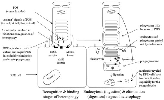 Three molecules, i.e., the CD36 receptor, αVβ5 integrin, and tyrosine-protein kinase c-Mer (MerTK), are involved in the initiation and regulation of heterophagy. The cell surface signaling receptor CD36 is required for both POS internalization (binding) and digestion [36]. αVβ5 integrin is necessary for binding POS to the RPE cells and for initiation of heterophagy in the diurnal rhythm; mice lacking αvβ5 integrin have gradually reduced retinal phagocytic capacity with age via the mechanism by which αvβ5 integrin acts as a POS receiver [37,38], and a deficit or lack of αvβ5 molecule leads to the loss of synchronized circadian heterophagy regulation with a subsequent accumulation of lipofuscin [39].