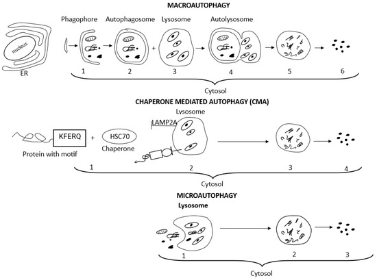 Schematic presentation of macroautophagy, chaperone-mediated autophagy, and microautophagy processes, which differ in how the targeted cytosolic content reaches the lysosomes for degradation. With regard to macroautophagy: (1) membrane isolation, vesicle nucleation, elongation, and phagophore (pre-autophagosomal structure) formation in cytosol, adjacent to the ER; (2) double-membrane autophagosome completed and matured; (3) lysosomes filled with hydrolytic enzymes; (4) vesicle breakdown, fusion of autophagosome with lysosome and autophagolysosome formation; (5) cargo degradation; (6) recycling of metabolites and nutrients to restore the nutrient balance. With regard to chaperone-mediated autophagy: (1) CMA substrates containing KFERQ-like motif are recognized by the HSC70 protein (chaperone) in the cytosol; (2) CMA substrates bind to LAMP2A; lysosome-associated membrane protein 2A. LAMP2A forms a translocation cluster through which the CMA substrates are translocated into the lysosomal lumen; (3) cargo degradation; (4) recycling of metabolites and nutrients. With regard to microautophagy: (1) direct engulfing of the cargo by invaginated lysosomal membrane without forming autophagosome; (2) cargo degradation; (3) recycling of metabolites and nutrients.