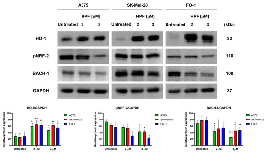 Initially, our primary objective was to determine whether HPF induces the expression of HO-1 and to identify the specific transcription factors associated with this induction. After the 24 h treatment of A375, SK-Mel-28, and FO-1 melanoma cells with 2 or 3 µM of HPF, immunoblot analysis revealed an increase in the expression level of HO-1 in all three cell lines (Figure 1). Unexpectedly, our findings indicated that NRF-2, the main transcription factor responsible for the induction of HMOX-1 gene transcription, did not contribute to the higher expression of HO-1. In fact, the phosphorylated and active form of NRF-2 (pNRF-2) exhibited a slight decrease upon HPF treatment (Figure 1). As a result, we investigated the expression level of BACH-1, a transcription factor known for inhibiting HMOX-1 gene expression. Intriguingly, the level of BACH-1 protein expression decreased after HPF treatment (Figure 1), providing an explanation for the HPF-dependent HO-1 upregulation.