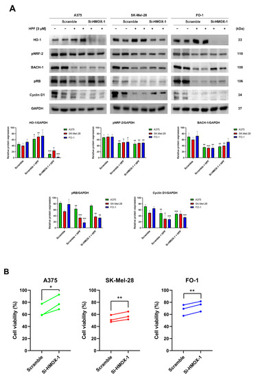 Previously, we demonstrated that HPF can inhibit melanoma cell proliferation by impairing retinoblastoma protein phosphorylation (pRB) and the expression of other cell cycle regulatory proteins, including cyclin D1 [33]. In the current study, immunoblots were performed to verify the decrease in pRB and cyclin D1 expression levels in cells transfected with Scramble siRNA and treated with HPF, compared to untreated cells (Figure 2A). Remarkably, when the HMOX-1 gene was silenced in cells treated with HPF, the expression level of pRB was partially restored in A375 and FO-1 cells, while the level of Cyclin D1 was only restored in the SK-Mel-28 cell line (Figure 2A). These findings suggest that the activation of the HO-1 pathway in melanoma cell lines contributes to the reduction in cell viability elicited by HPF.