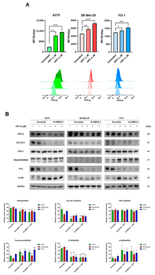 There is indeed substantial evidence supporting the significant involvement in melanoma progression of the resistance to the ferroptosis pathway [65]. Our findings highlight the complexity of the cellular response to HPF and suggest the involvement of several alterations in protein expression targeted by HPF. The combination of these alterations, leading to iron unbalance and lipid peroxidation, may sensitize melanoma cells to cell death through ferroptosis.