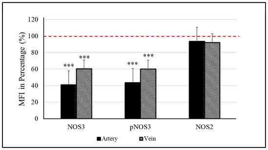 Endothelial (NOS3) and inducible nitric oxide synthase (NOS2) levels in the umbilical cord vessels. Quantifying the mean fluorescence intensity (MFI) in percentage determines the level of NOS3 and its phosphorylated status at Ser1177 residue (pNOS3) along with the expression of NOS2 of the low-weight twin neonates (D-Lwt), where the values of their high-weight siblings (D-Hwt) were taken as 100% (red dotted line) (n = 18 pairs). Statistical significance was accepted at *** p < 0.001 based on one-way ANOVA using the Newman–Keuls multiple comparison test. Statistical analysis was performed on the measured MFI data set.