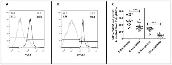 NOS3 protein level and its activation by the phosphorylation at the Serine1177 position were immunostained for NOS3/Glycophorin and pNOS3/Glycophorin and analyzed using FACS (Figure 2). Representative histograms indicate that, in the low-weight neonates, both the NOS3 expression and activation (pNOS3) were far behind the higher-weight siblings’ values (an arbitrary borderline at 102 was considered along the x-axis dividing the total RBC population into basal- and high-intensity groups). In the higher-weight neonates, ~89% and 98% of the Glycophorin-positive cells showed high NOS3 and pNOS3 intensity levels, respectively, whereas, in the case of their smaller siblings, these numbers reached only 12% and 18% (Figure 2A,B). Taking into account the total data set (n = 18), it is clear that there are differences of 35–38% and 55–62% in NOS3 and pNOS3 intensity levels, respectively, between the siblings (Figure 2C).