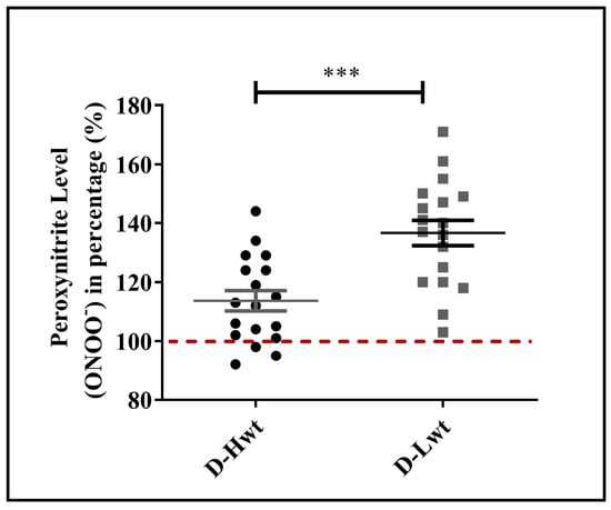 Peroxynitrite level in the mature, birth weight–discordant twin population. Peroxynitrite levels of RBC populations derived from mature (D-Hwt—black and D-Lwt—gray), birth weight–discordant siblings (n = 18 pairs). Values were expressed in percentages of age- and weight-matched, mature, birth weight–non-discordant twin neonates, taken as control (100%). Statistical significance was accepted at *** p < 0.001 by one-way ANOVA using the Newman–Keuls multiple comparison test.