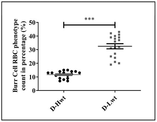 As a further consequence of the substantial stress condition, significant alterations in the phenotypical variants were detected, and as a result, RBCs were losing their characteristic biconcave disk-shaped structures. Altogether, ~17,000 cells were counted from the n = 18 pairs of siblings and analyzed using the bio-image analysis tool Cell Profiler™. In the Lwt siblings, the Burr cell population was found to be ~30% of the total RBC population (Figure 5 and Figure S7), and even besides that, a formation of the Rouleaux phenotype was also detectable within ~4–5%.