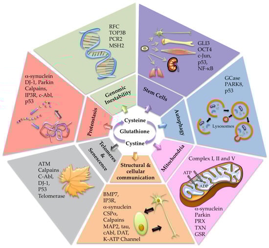 To determine the intricate connections among the diversity of biochemical pathways intervening in the pathophysiology of PD, we have proposed the disturbance of the cysteine redox proteome [16] as the essential underlying pathogenic hub that likely explains this complexity, opening the possibility of new therapeutic options [17]. Although most neurodegenerative diseases, including PD, show differences in symptomatology and evolution, which seem typical of each disorder, they share proteomic deregulation associated with redox disturbances and the accumulation of specific proteins that finally end in neuronal death. Additionally, glutathione (GSH) precursors have proven beneficial effects in diabetes, hypertension, obesity, and other chronic comorbidities that contribute to neurodegeneration, and recent clinical trials have shown a significant benefit of N-acetyl-cysteine (NAC) in PD, probably related to the upregulation of the cysteinome. Since the combination of many different molecular pathways plays a critical role in the mechanisms of cell rejuvenation and regeneration, the present article has focused on adding and complementing scientific evidence supporting the potential beneficial effect of GSH precursors against the deregulation of the redox proteome in PD.