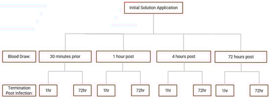 Whole blood samples from each time point of the blood draw were diluted with RPMI with 5% AB serum and inoculated with M. avium for a whole blood infection assay. Briefly, RPMI-diluted blood samples were infected in vitro with processed M. avium with a multiplicity of infection ratio of 1:10 (bacteria: PBMCs) in triplicate in a 96-well culture plate. M. avium-infected blood samples were incubated at 37 °C with 5% CO2 and terminated at 1 h and 72 h post-infection. The 1 h termination point signifies a sudden response to infection, and the 72 h point reflects sustained infection. During termination, cells from infected blood samples were lysed with cold sterile nanopure water to liberate phagocytosed mycobacterium. Cell lysates were serially diluted, plated on 7H11 agar, and incubated at 37 °C for 2 weeks. Colony-forming units (CFUs) were counted on each plate to assess bacterial burden and survival. An overview of the blood draws and infection termination time points. A summary of the whole blood infection assay is demonstrated in Figure 2.