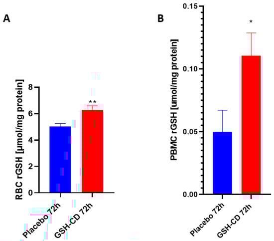 Figure 3. Glutathione (GSH) levels in healthy patients receiving placebo or GSH-CD topical treatment. (A) Levels of the reduced form of GSH in the RBCs isolated from the placebo (n = 12) and GSH-CD (n = 12) groups at 72 h post-initial application. (B) Levels of reduced GSH in the PBMCs isolated from the placebo (n = 12) and GSH-CD (n = 13) groups at 72 h post-initial application. Measurements for the rGSH levels are normalized against the total protein levels in the RBCs and PBMCs. All comparisons were made via an unpaired t-test with Welch’s correction. Single and double asterisks indicate statistical significance with p-values < 0.05 and <0.005, respectively.