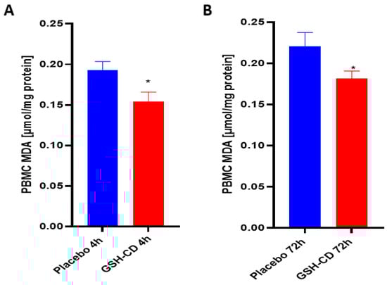 Figure 4. Malondialdehyde (MDA) levels in healthy patients receiving placebo or GSH-CD topical treatment. (A) MDA levels in the PBMCs isolated from the placebo (n = 12) and GSH-CD (n = 12) groups at 4 h post-initial application. (B) MDA levels in the PBMCs isolated from the placebo (n = 12) and GSH-CD (n = 12) groups at 72 h post-initial application. Measurements for the PBMC MDA are normalized against total PBMC protein levels. All comparisons were made via an unpaired t-test with Welch’s correction. Asterisks indicate statistical significance with a p-value < 0.05.