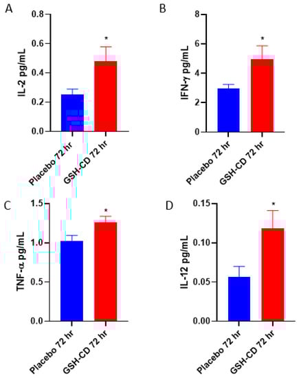 Figure 5. Cytokine profile of healthy patients receiving placebo or GSH-CD treatment. (A) Levels of IL-2 in the plasma isolated from the placebo (n = 11) and GSH-CD (n = 11) groups at 72 h post-initial application. (B) Levels of IFN-γ in the plasma isolated from the placebo (n = 14) and GSH-CD (n = 14) groups at 72 h post-initial application. (C) Levels of TNF-α in the plasma isolated from the placebo (n = 13) and GSH-CD (n = 15) groups at 72 h post-initial application. (D) Levels of IL-12 in the plasma isolated from the placebo (n = 13) and GSH-CD (n = 13) groups at 72 h post-initial application. All comparisons were made via unpaired t-test with Welch’s correction. Asterisks indicate statistical significance with a p-value < 0.05.