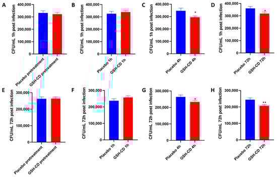 Figure 6. In vitro M. avium survival in whole blood of healthy patients receiving placebo (n = 15) or GSH-CD (n = 15) topical treatment. (A) M. avium survival 1 h post-infection in blood drawn from placebo and GSH-CD groups 30 min prior to topical treatment. (B) M. avium survival after 1 h post-infection in blood drawn from placebo and GSH-CD 1 h post-initial topical application. (C) M. avium survival 1 h post-infection in blood drawn from the placebo and GSH-CD 4 h post-initial topical application (D) M. avium survival 1 h post-infection in blood drawn from placebo and GSH-CD at 72 h post-initial application. (E) M. avium survival after 72 h incubation in blood drawn from the placebo and GSH-CD 30 min prior to initial application. (F) M. avium survival after 72 h incubation in blood drawn from the placebo and GSH-CD at 1 h post-initial application. (G) M. avium survival after 72 h incubation in blood drawn from placebo and GSH-CD 4 h post-initial application. (H) M. avium survival after 72 h incubation in blood drawn from placebo and GSH-CD at 72 h post-initial application. All comparisons were made via an unpaired t-test with Welch’s correction. A single asterisk (*) indicates statistical significance with a p-value < 0.05. Double asterisks (**) indicate statistical significance with a p-value < 0.005.