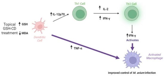 The topical application of the glutathione–cyclodextrin nanoparticle complex is a non-invasive route of administration for GSH delivery with no reported side effects in healthy patients. GSH-CD treatment may enhance the immune response, resulting in a reduction in the burden of M. avium in vitro. Improved M. avium control may be a result of increased rGSH levels, reduced oxidized stress, and increases in the Th1 cytokines IFN-γ, IL-12p70, IL-2, and TNF-α after GSH-CD treatment (Figure 7).
