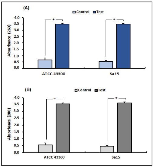 Release of bacterial cell content, assessed by measuring the absorbance at 260 nm (A) and 280 nm (B), in both MRSA strains (ATCC 43300 and Sa15) treated with 1,8-cineol. The results are expressed as mean absorbance ± SD. * Represents significant difference (p < 0.05) between each treated strain with the negative control.