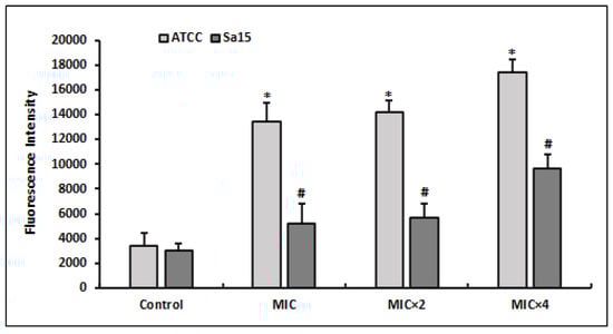 Quantitation of intracellular ROS production by MRSA strains (ATCC 43300 and Sa15) after 24 h treatment with various concentrations of 1,8-cineol (MIC to MIC × 4), using the DCFA-DA probe. The results are expressed as the mean fluorescence intensity ± SD. * and # represent significant difference (p < 0.05) between each treatment with the negative control.