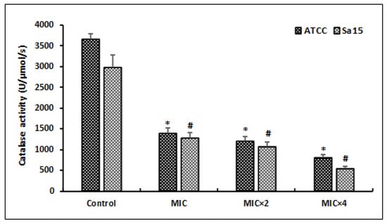 Effect of various concentrations of l,8-cineol on the antioxidant enzyme activity (catalase) in MRSA cells (ATCC 43300 and Sa15). The strains were incubated with different concentrations of l,8-cineol (MIC to MIC × 4) for 24 h. *; # represents a significant difference (p < 0.05) between each treatment and the negative control.
