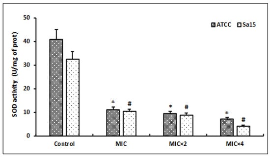 The SOD levels were significantly decreased in the bacterial lysates of the tested strains after treatment with this molecule (p < 0.05). Initially, the untreated bacterial cells (control) showed SOD amounts of 32.6 to 41.1 U/mg proteins in the ATCC and Sa15 strains, respectively. The SOD values were significantly decreased after the treatment with doses of MIC and MIC × 2 (p < 0.05). Higher concentrations of this molecule (MIC × 4) further decreased the SOD levels to 4.2 U/mg and 7.2 U/mg protein in the Sa15 and ATCC 43300 strains, respectively.
