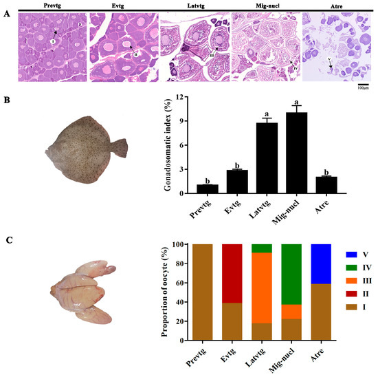 Ovarian development of turbot Scophthalmus maximus during reproductive cycle. (A) Development and types of turbot oocyte: I, arrows indicate oocytes at the stage of previtellogenesis and their nucleoli are on the periphery of the germinal vesicle. II, arrows indicate oocytes at the stage of early vitellogenesis and gradual accumulations of yolk granules in the central region. III, arrows indicate oocytes at the stage of late vitellogenesis, the yolk granules almost fill the ooplasm, and the nucleus has not yet begun to migrate peripherally. IV, arrows indicate oocytes at the stage of migratory nucleus, the yolk granules have attained their maximum size just prior to spawning, and the nucleus is not evident. V, arrows indicate oocytes at the stage of atresia have shrinkage or collapse. (B) Gonadosomatic index of female turbot during ovarian development. Values are represented as the mean ± SEM (n = 6). Bars with different superscript letters are significantly different (p < 0.05). (C) Proportions of oocytes at different developmental stages in turbot ovary. I, II, III, IV, V represent five different developmental stages of oocytes. Prevtg, previtellogenic; Evtg, early vitellogenic; Latvtg, late vitellogenic; Mig-nucle, migratory nuclei; Atre, atresia.
