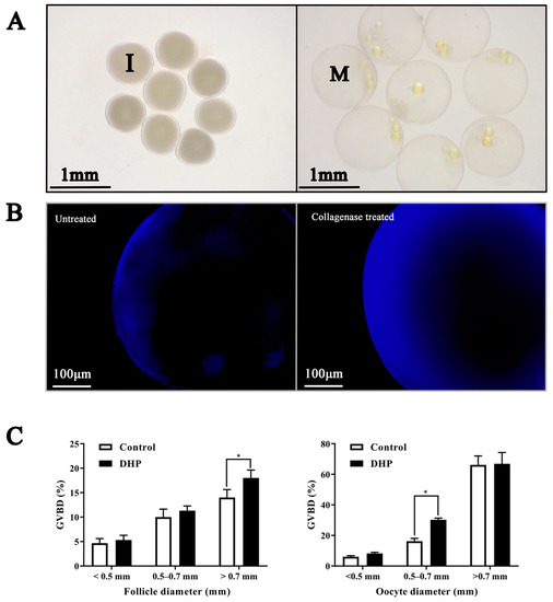 The turbot oocytes were separated using a mechanical method according to previous studies in zebrafish [48,49] and perch [21], with some modifications. Briefly, after fasting and anesthetization, the healthy follicles were separated from turbot late-vitellogenesis ovaries using forceps, and then washed in cold phosphate-buffered saline (Ca2+-Mg2+-free) solution with penicillin–streptomycin (Solarbio, Beijing China) three times. The follicles were separated into two groups. In one group, the follicles were digested with 0.3 mg/mL collagenase (Solarbio, Beijing, China) in a shaking water bath at 20 °C for 40 min in order to remove the follicular cell layer. After enough denuded oocytes were obtained, the oocytes were washed with fresh Ca2+-Mg2+-free DMEM medium at least three times to remove the remaining collagenase. In the other group, the follicles remained in fresh Ca2+-Mg2+-free DMEM medium and were left untreated with collagenase. Denuded oocytes and remaining follicles (untreated with collagenase) with three different diameters (<0.5 mm, 0.5–0.7 mm, >0.7 mm) were carefully selected and pooled. The same diameters of oocytes and follicles were randomly distributed in wells of a 24-well plate (Saiguo Biotech Co., LTD., Guangzhou, China) at a density of 50 oocytes/well or 50 follicles/well in 1 mL Ca2+/Mg2+-free DMEM medium at 14.5 °C. Germinal vesicle breakdown (GVBD) is an easily identifiable marker for oocyte maturation. The follicles and denuded oocytes were incubated for 24 h in the presence or absence of DHP (10−6 M) in order to score the GVBD and identify the optimal size of denuded oocytes to be used for in vitro studies.