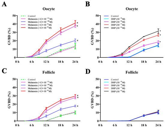 To further identify the response of optimal size of denuded oocytes under oocyte-maturation-related hormone treatment, the GVBD rate of the oocytes was detected. The denuded oocytes (0.5–0.7 mm) and follicles were isolated and incubated with DHP (10−6, 10−7, 10−8, 10−9 M) and melatonin (4.3 × 10−8, 4.3 × 10−9, 4.3 × 10−10, 4.3 × 10−11 M) for 24 h. The control group received only the vehicle. The GVBD of denuded oocytes and follicles were counted. The specimens of the melatonin treated were collected and divided into two groups. One was snap-frozen in liquid nitrogen or preserved in RNAstore Reagent (Tiangen Biotech, Beijing, China) and then stored at −80 °C until RNA extraction, and the other was collected and then stored at −20 °C to analyze CAT, GSH-Px, and SOD activity as well as MDA, GSH, ROS, and cAMP content. All experiments were repeated three times to confirm the results. Triplicate wells were used for each endpoint or treatment within an experiment; therefore, a total of nine samples were collected per group in the current study.