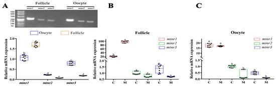 Effect of melatonin on its receptor expression in turbot Scophthalmus maximus. (A) Detection of melatonin receptors (mtnr1, mtnr2, mtnr3) expression in turbot follicle and oocyte (B,C) Expression of melatonin receptors (mtnr1, mtnr2, mtnr3) in turbot follicles and oocytes after treatment with melatonin (4.3 × 10−9 M) for 24 h. Values are represented as the mean ± SEM (n = 9). Bars with different superscript letters are significantly different (p < 0.05). mtnr1: melatonin receptor 1; mtnr2: melatonin receptor 2; mtnr3: melatonin receptor 3.