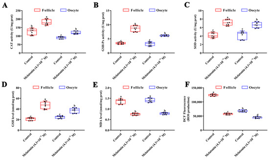 Effect of melatonin on antioxidant capacity in turbot (Scophthalmus maximus) follicles and oocytes after treatment for 24 h. (A) CAT activity; (B) GSH-Px activity; (C) SOD activity; (D) GSH content; (E) MDA levels; and (F) ROS levels. Values are represented as the mean ± SEM (n = 9). Bars with different superscript letters are statistically different (p < 0.05). CAT: catalase; GSH-Px: glutathione peroxidase; SOD: superoxide dismutase; GSH: glutathione; MDA: malondialdehyde; and ROS: reactive oxygen species.