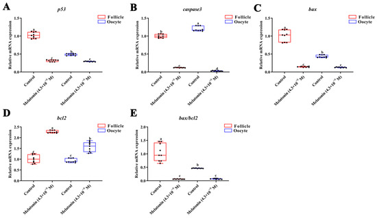 The mRNA levels of the main genes involved in cell apoptotic signaling processes in the oocytes and follicles of turbot were altered under 24 h melatonin treatment (Figure 6). The mRNA levels of p53, caspase3, bax, and bax/bcl2 significantly decreased under melatonin treatment for 24 h (Figure 6A–C, p < 0.05). Melatonin significantly upregulated bcl2 mRNAs (Figure 6D,E, p < 0.05).
