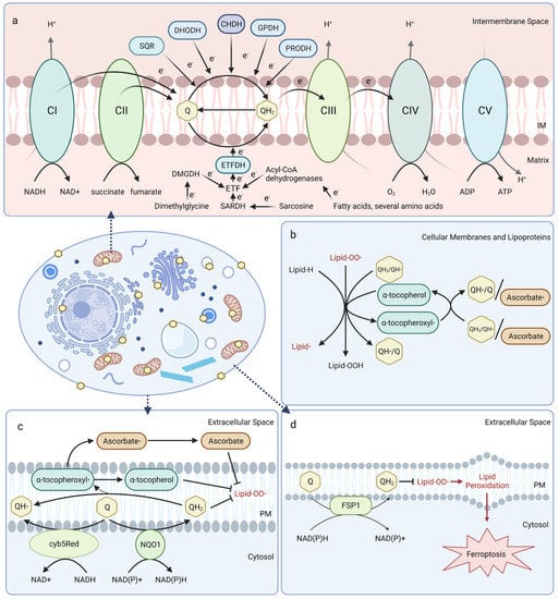 Coenzyme Q functions. (a) Mitochondrial CoQ shuttles electrons in the electron transport chain and is reduced by dehydrogenases in diverse metabolic pathways. CI, Complex I; CII, Complex II; CIII, Complex III; CIV, Complex IV; CV, Complex V; DHODH, dihydroorotate dehydrogenase; GPDH, glyceraldehyde-3-phosphate dehydrogenase; SQR, sulfide:quinone oxidoreductase; CHDH, choline dehydrogenase; PRDH, proline dehydrogenase; ETF, electron transfer flavoprotein; ETFDH, electron transfer flavoprotein dehydrogenase. (b) CoQH2 is present in cellular membranes and lipoproteins and acts as a chain-terminating antioxidant to inhibit both the initiation and propagation steps of lipid autoxidation. CoQH2 or ascorbate regenerate vitamin E from the tocopheroxyl radical. (c) CoQ functions in the plasma membrane redox system (PMRS) with other antioxidants, such as vitamin E and ascorbate. CoQ is reduced by NAD(P)H:quinone oxidoreductase 1 (NQO1), or NADH-cytochrome b5 reductase (cyb5Red). (d) The CoQ reductase ferroptosis suppressor protein 1 (FSP1) regenerates CoQH2 at the plasma membrane to terminate lipid peroxidation and suppress ferroptosis. Created with Biorender.com (accessed on 23 May 2023).