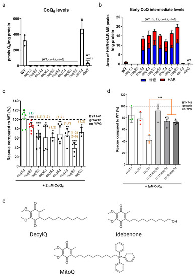 Yeast coq mutants are rescued with exogenous CoQ6 but not non-isoprenoid CoQ analogues. (a) CoQ6 was not detected in any of the coqΔ mutants. CoQ6 (pmol/mg protein) was determined based on a CoQ6 standard curve as described in (Tsui et al., 2019). (b) Each of the coq mutants, from coq3Δ to coq9Δ, accumulated early CoQ6 intermediates (HHB and HAB). The amount of HHB and HAB was calculated as the area of the MS peak/mg protein. (c) Yeast mutants harboring deletions in either the COQ1 or COQ2 gene showed more robust rescue in response to exogenous CoQ6 treatment than do the other single coq null mutants (coq3Δ–coq9Δ). (d) Additional deletions of either COQ1 or COQ2 restored the deficient CoQ6-rescue of a coq3Δ mutant, but do not affect the phenotype observed in coq1Δ or coqΔ2 strains. Columns represent the degree of rescue (in %) ± SD of a strain compared to WT, which is defined as 100% and represented as a dashed line. Statistically significant differences between a specific coqΔ mutant and one of its counterparts (another coqΔ mutant) are denoted with numbers in parentheses on top of the columns. (1) represents differences comparing to coq1Δ, (2) represents differences comparing to coq2Δ, (3) represents differences comparing to coq3Δ, etc. Three or more independent rescue experiments were performed for every strain. Asterisks on top of the columns represent significant differences when compared to WT (* p < 0.05, ** p < 0.01, *** p < 0.001). (e) Structures of CoQ analogues. Panels (a–d) reproduced with permission from Fernandez-del-Rio et al. Free Radicals in Biology and Medicine, published by Elsevier, 2020 [18]. Created with Biorender.com (Accessed on 27 June 2023).