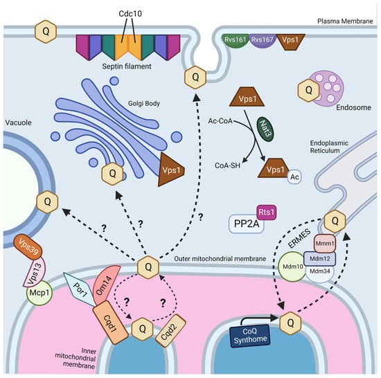 Pathways and proteins involved in trafficking of CoQ6 to and from mitochondria. See text for the description of gene products that are involved in transport of CoQ6 in yeast. The endoplasmic reticulum-mitochondria encounter structure (ERMES) is formed by Mdm10 and Mdm34 at the outer mitochondrial membrane, Mdm12 in the cytosol, and Mmm1 on the ER membrane. Septin filaments are hetero-oligomeric complexes composed of septin subunits, including Cdc10, Cdc3, Cdc12, Cdc11, and sometimes Shs1. PP2A, protein phosphatase 2A. Dashed lines denoted with question marks indicate postulated pathways of CoQ trafficking. Created with Biorender.com (Accessed on 25 May 2023).