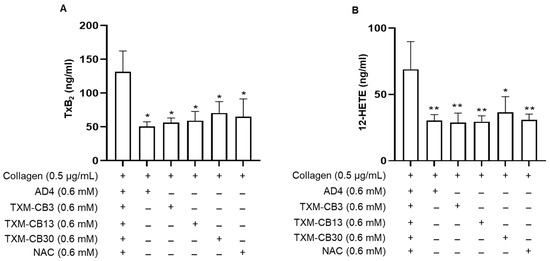 Inhibition of TxB2 and 12-HETE synthesis by N-acetylcysteine amide (AD4), thioredoxin-mimetics (TXM-CB3, TXM-CB13, TXM-CB30), and N-acetylcysteine (NAC). PRP was incubated with the vehicle or the different compounds for 30 min at 37 °C with constant stirring. Subsequently, platelets were stimulated with collagen (0.5 µg/mL). At the end of aggregation, platelet aggregates were pelleted and the levels of (A) TxB2 and (B) 12-HETE were simultaneously measured. n = 3. * p < 0.05, ** p < 0.01, vs. collagen-stimulated PRP for ANOVA and Dunnett’s post hoc test.
