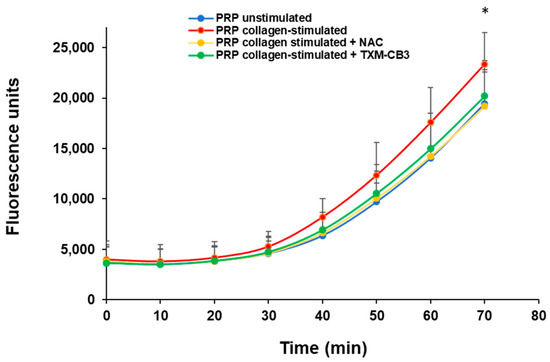 Total antioxidant activity. PRP was preincubated with vehicle, TXM-CB3, or NAC for 30 min at 37 °C with constant stirring. Platelets were stimulated with 0.5 µg/mL collagen. After 6 min plasma was separated via centrifugation and antioxidant activity was detected via DCF fluorescence. Data are expressed as fluorescence units of DCF. n = 5. * p < 0.05 vs. unstimulated PRP (70 min).