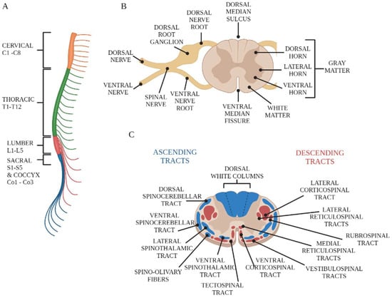 Spinal cord anatomy. (A) Neuromeres of spinal cord. (B) Organization of spinal cord into gray matter, containing neuronal cell bodies, and white matter, (C) containing myelinated axons organized in ascending or descending tracts (created with BioRender.com, https://app.biorender.com, accessed on 26 June 2023).