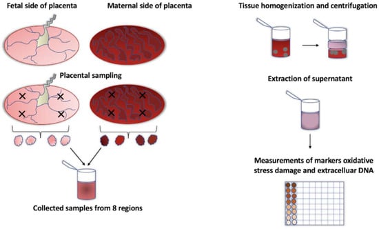 The process of preparing tissue samples involved the collection of placental tissue from eight specific regions, with four regions taken from the maternal side and four from the fetal side. The collected samples were homogenized with the aim of obtaining a supernatant, which was further used in downstream processes.