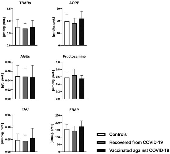 Concentration of thiobarbituric acid-reacting substances (TBARS), advanced oxidation protein products (AOPP), advanced glycation end products (AGEs), fructosamine, total antioxidant capacity (TAC), ferric-reducing antioxidant power (FRAP), and ratio (GSH/GSSG) of the oxidized and reduced glutathione. Differences between the selected groups were assessed with the ANOVA test. Data are shown as mean and standard deviation.