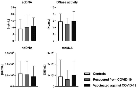 Table 1 summarizes the clinical parameters of the women who participated in the study. Of the total 126 women, 23 women recovered from COVID-19, 20 women were vaccinated, and 83 women were assigned to the control group. The average maternal age was around 32 years. Overcoming COVID-19 or vaccination against COVID-19 had no effect on the gestational age, weight, or height of the newborn. In all three groups of women, the most common mode of delivery was vaginal delivery, regardless of the recovery from COVID-19 or being vaccinated. There were no differences between groups in gravida and para parameters. Analysis of oxidative damage markers of the oxidative stress showed no significant difference between groups (p = ns) (Figure 2). The average concentration of ecDNA in the control group was 9.29 ± 6.63 ng/mL. In the COVID-19-recovered and vaccinated-against-COVID-19 groups, the average ecDNA concentrations were 10.40 ± 8.94 ng/mL and 11.32 ± 5.99 ng/mL, respectively, and no differences between groups were confirmed (H = 2.65, p = 0.26). No differences were observed regarding the DNase activity (F = 0.756, p = 0.47) (Figure 3). The average DNase activity in the control group was 5.8 ± 2.3 KU/mL. In women recovered from COVID-19, the average DNase activity was 5.08 ± 1.74 KU/mL and in the group of women vaccinated against COVID-19 it was 5.9 ± 2.88 KU/mL (Figure 3).